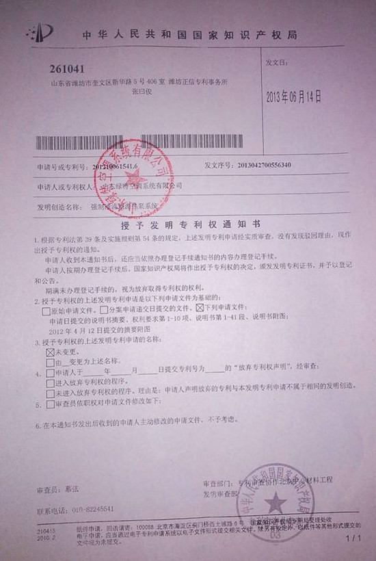 6月22日,山东绿特空调系统有限公司(以下称集团)接到中华人民共和国国家知识产权局授予的关于“强制渗流地源热泵系统”发明专利权通知书,这标志着集团长期以来坚定不移贯彻“严谨高效、开拓创新,创行业经典,占行业鳌头”的创新理念成效巨大;强制渗流地源热泵系统的发明创造既是集团产品技术研发部门心血凝聚的结晶,也更是集团上下团结一致、辛勤努力的硕果。 集团董事长王泽富,在十一年前创建时,就确立以专利等无形资产作为参与市场差异化竞争的利器,将知识产权的创造、运用、保护、管理作为集团经营的核心理念,并坚定不移的贯彻到发展全过程中。目前,仅专利就取得并保有数十项,形成了较完整的产品专利保护网。此次强制渗流地源热泵系统被授予发明专利权是在专利发明道路上的又一次成绩,集团会再接再厉,力求进一步完善知识产权保护体系,形成持续创新机制,发挥自主知识产权优势,提升企业综合实力!