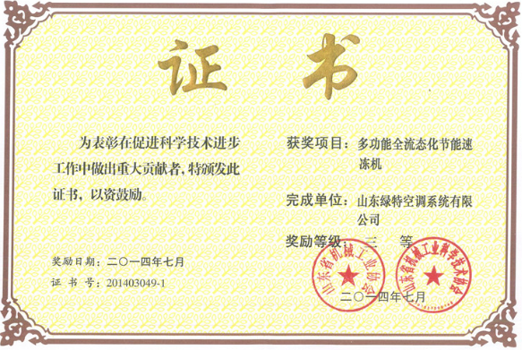 为表彰在促进科学技术进步工作中做出重大贡献的单位,山东省机械工业协会和山东省机械工业科学技术协会颁发了促进科学技术进步工作贡献奖,绿特集团的多功能全流态化节能速冻机荣获三等奖。
