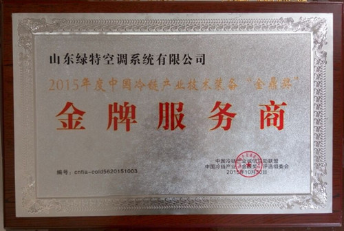 2015年10月29-31日第二届中国食品冷链企业家年会暨冷链投融资峰会在江苏徐州举办,同时举行了2015年度中国冷链产业技术装备“金鼎奖”的颁奖盛典,作为冷冻冷藏行业的后起之秀,绿特冷链荣获金牌服务商荣誉称号。