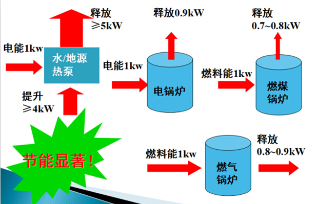绿特水地源热泵节能高效,能效比较高,与传统的电能、燃料供热对比如图: