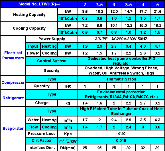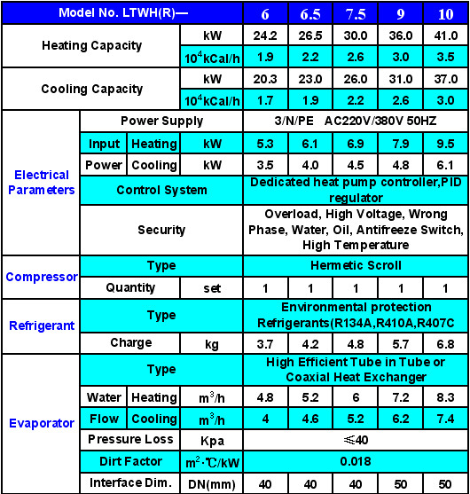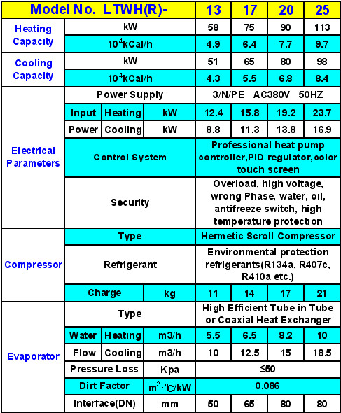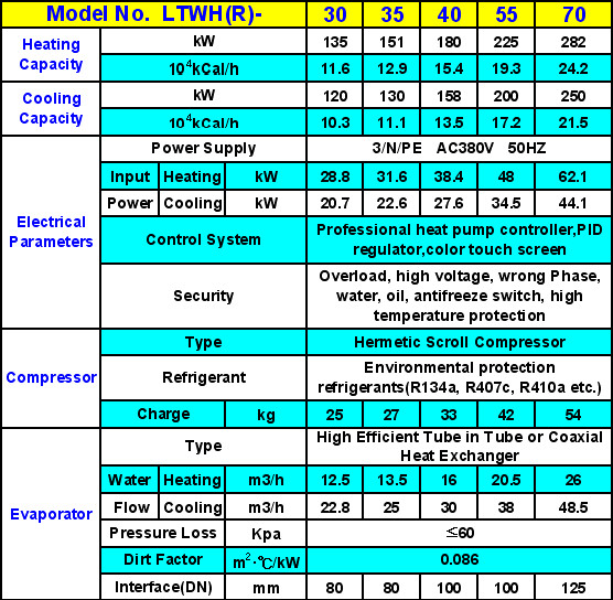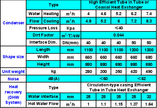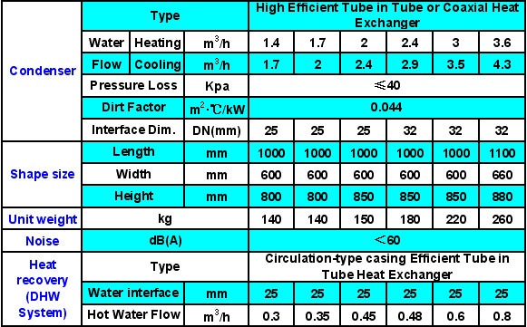 Notes: 1.Cooling Standard Conditions:User side water inlet/outlet 12℃/7℃;Water source side inlet/outlet 30℃/35℃. 2.Heating Standard Conditions: User side hot water inlet/outlet 40℃/45℃;Water source side inlet/outlet 15℃/7℃; Max. Hot Water Output: R410a-55°C; R134a-65°C; R407c-55°C; 3.Heat recovery equipments can be added for free sanitary hot water.