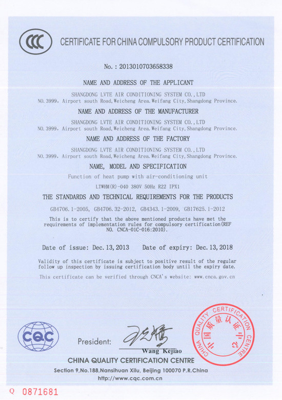 CCC认证 CCC认证即是“中国强制性产品认证”,其英文名称为“China Compulsory Certification”,简称CCC认证或3C认证。CCC认证的标志为“CCC”,是国家认证认可监督管理委员会根据《强制性产品认证管理规定》制定的,以强制性产品认证制度替代原来的进口商品安全质量许可制度和电工产品安全认证制度,也是国际上广泛采用的保护消费者权益、维护消费者人身财产安全的基本做法。 关于绿特 山东绿特空调系统有限公司是一家生产水源热泵机组、地源热泵机组、污水源热泵机组等中央空调主机,冷水机组,冷冻冷藏,换热机组,压力容器和化工设备的专业生产企业,拥有2个热泵技术研发中心和高素质的研发队伍,1套热泵设备实验室,1个探伤室,一个制冷空调产品综合性能实验中心。公司技术力量雄厚,并且能够严格执行ISO9001:2008质量管理体系认证的标准,技术水平达到国内先进水平和国际领先水平,诚邀相关专家到公司开展技术交流与合作,从而保证了产品的质量。如有需要,请关注官网www.sd-lt.cn