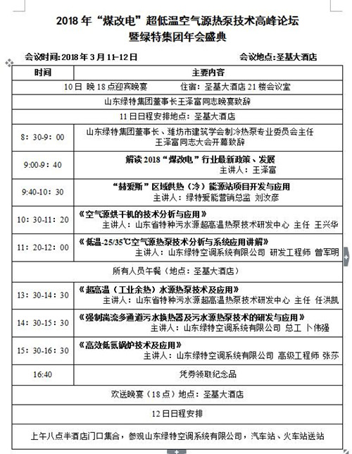 由山东绿特集团主办、山东省建筑节能协会支持召开以节能环保、煤改清洁能源为主题的“2018年煤改清洁能源供热技术高峰论坛暨绿特集团年度盛典”定于2018年3月11-12日在山东潍坊圣基大酒店召开,因会议时间临近,现将会议内容及会议报到安排说明如下: 一、报到时间和地点: 1. 时间:2018年3月10日全天 2. 地点:潍坊圣基大酒店 地址:胜利街1500号(胜利街月河路路口) 二、会务费: VIP嘉宾免费,其他单位代表、个人200元/人(含资料费、食宿费、考察费,交通费用自理)。 三、住宿标准:提供食宿(四星,含早餐)。 四、报到及会务安排: 1.报到时间:3月10日全天,报到地点:潍坊圣基大酒店。 注:如代表提前或晚于此时间报到,请提前与会务组联系。 2.会议用餐:会议安排10日晚宴,11日会议期间用餐,11日晚宴。 3.住宿安排:住宿请提前与会务组联系。3月12日上午之前12:00为会议代表退房时间,请代表安排好时间,及时办理退房手续; 4.如有代表临时参会,请直接与会务组联系。 注:报到时领取会议资料、参会卡、餐券、住宿卡等。凭卡入会场,凭券用餐。 五、会务人员联系方式: 王瑞美18765782020 0536-2257466 刘金涛15265622968