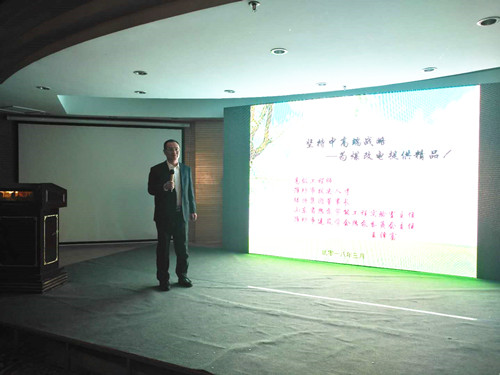 会议开始,由山东绿特集团董事长、潍坊市建筑学会热泵专业委员会主任王泽富先生做大会开幕致辞,王董首先对现场各位嘉宾的到来表示热烈的欢迎,并对2018“煤改电”行业最新的政策发展进行了深入的分析解读,王董表示随着“煤改电”政策的推广,煤改清洁能源已然成为了各省市实现冬季清洁供暖与治霾的重要手段,市场潜力巨大,因此绿特将加大产品研发与创新力度,抓住机遇,从而更好的为清洁供暖与环境保护作出贡献。最后王董向大家详细的介绍了国内外首创、国际领先的爱能森赫爱斯“储能+多能互补+智慧能源系统”,王董的讲话赢得了在场所有人的掌声与喝彩。