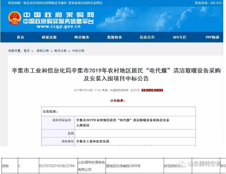 近日,河北省辛集市2019年农村地区居民取暖“电代煤”电取暖设备采购及安装入围项目中标公告结果正式公示,绿特凭借先进的生产设备、雄厚的技术实力成功中标!