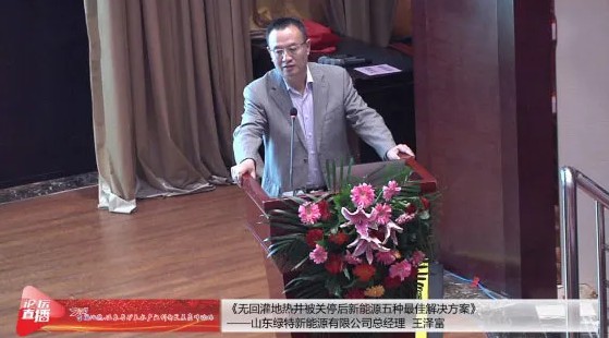 此次论坛绿特受邀出席,绿特董事长王泽富先生并以“替代无回灌水源热泵和地热井供热新能源解决方案及地热梯级利用”为主题做了精彩的发言演讲。王董从目前水源热泵和地热井供暖情况、可替代的新能源供暖技术、地热梯级利用等多个方面进行了详细的讲解,为替代无水回灌提供了多种解决方案。王董的演讲赢得了在场所有与会人员的鼓掌喝彩。