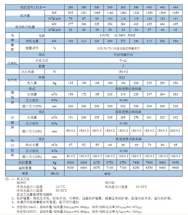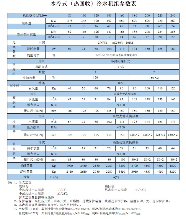水冷式(热回收)冷水机组 制冷量276~1650kw 热回收量82~495kw 采用自来水为空调热源,可增设热回收器。在一般空调使用工况下,水温需求为30~65℃时,可回收热量为制冷量的30%~80%;水温需求为55~60℃时,可回收热量为30%。热回收器可直接安装在中央空调机组上,不占用建筑面积,具有防止结垢和水质软化处理功能。 产品特点 具有多种特殊设计齿形结构设计的换热铜管,外形精致小巧,结构紧凑。机种齐全,可根据客户要求特别制作。 采用人性化为电脑控制系统,设有高低压力保护开关、过流间电器、排气高温开关、油压差控制、水流量开关、相序保护、安全阀、熔断器等保护措施,保护机组运行;液晶PLC操作界面,能随时监控机组运行状态。 采用有段式或无极容量调节,在0~25%~50%~75%~100%的冷量调节范围内,保证随时与符合匹配,使制冷机平稳运行。 利用废热提供所需热水,大大减少了供热锅炉向大气排放的CO2气体,减小温室效应。压缩机的一部分热量经过热回收器吸收以后,原冷凝器的热负荷减少,热交换效率提高,空调机组的效率提高,耗电量也显著减少;同时,采用热回收技术以后,机组的符合减少,实用寿命延长。