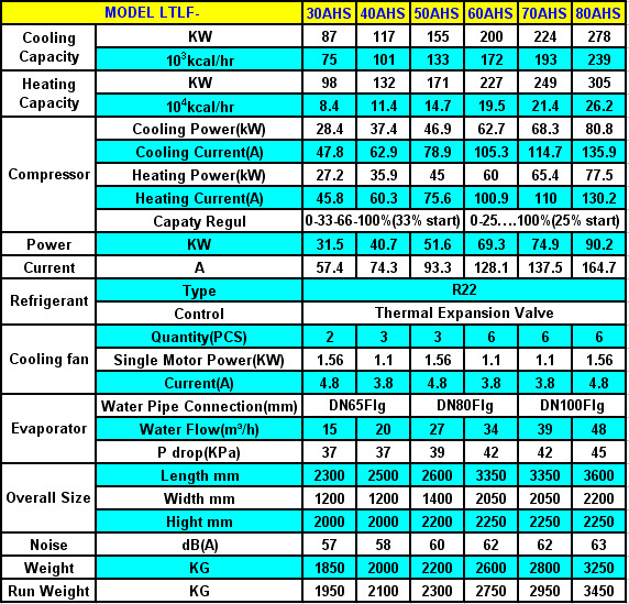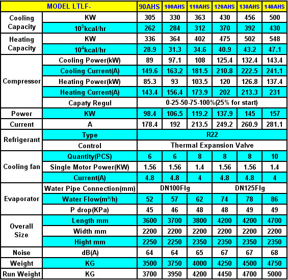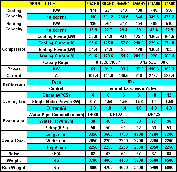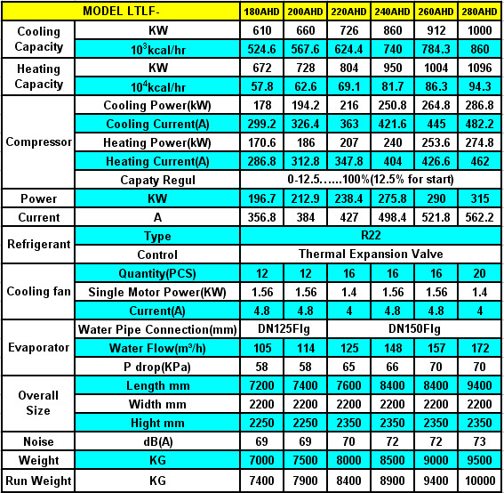 Remark:1.Colling Condition:Chilled water in/out 12/7℃; Environmental 35℃; 2. Heating Condition: Heat water in/out 40/45℃,Environment dry bulb temperature 7℃,wet bulb temperature 6℃; 3.Power supply: 3P-380V-50HZ;with voltage allowance ±10%,voltage dif between the phase lines±2%; 4.The data above is for R22, contact us if that for R134a, R407C and other refrigerant need; 5.There may be Changes for improvement without notice, confirm always before your order. Double Screw Compressors Models: LTLF60AHD-LTLF280AHD Cooling Capacity:174-1000KW/Heating Capacity:196-1096KW