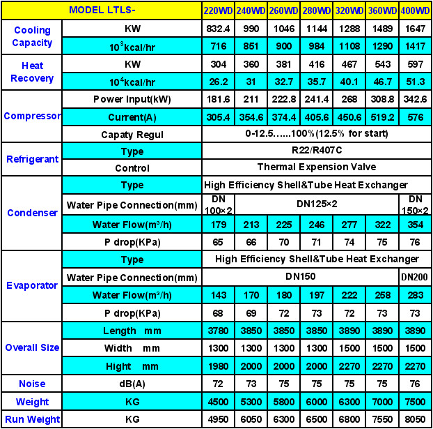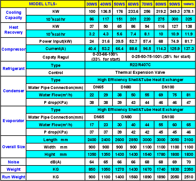 Remark:1.Colling Condition: Chilled water in/out 12/7℃; Cooling water in/out 30/35℃; 2.Power supply: 3P-380V-50HZ;with voltage allowance ±10%,voltage dif between the phase lines±2%; 3.The data above is for R22, contact us if that for R134a,R407c and other refrigerant need; 4.There may be Changes for improvement without notice, confirm always before your order.