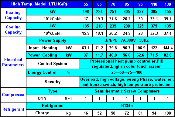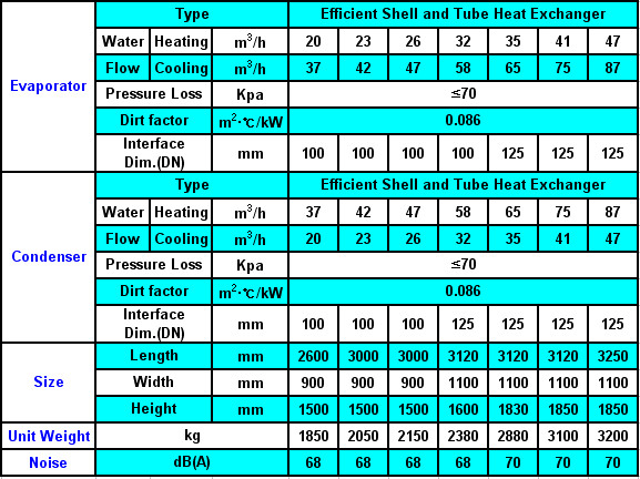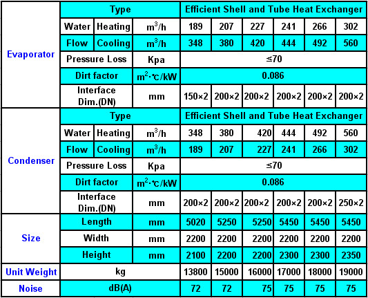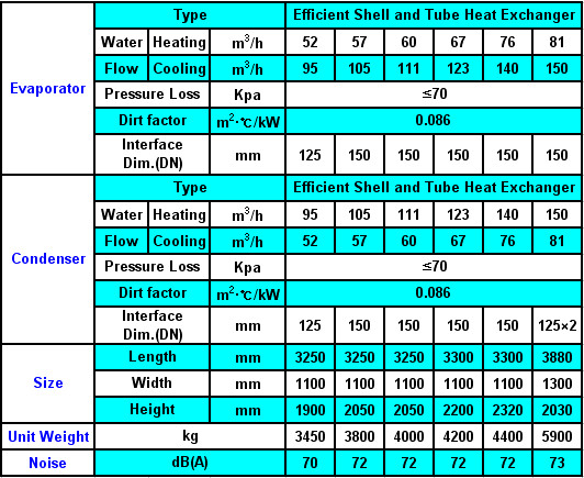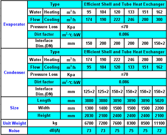 Working Design Standard Conditions: 1.Cooling Standard Conditions:condenser water inlet/outlet temperature18ºC/29ºC, evaporator water inlet/outlet temperature 12ºC/7ºC; 2.Heating Standard Conditions: condenser water inlet/outlet temperature 55ºC/60ºC, evaporator water inlet/outlet temperature 15ºC/7ºC; Max. Hot Water Output 65ºC; 3.Heat recovery equipments can be added.