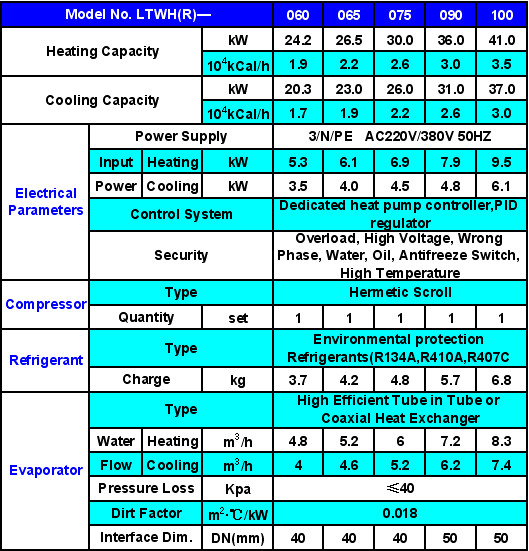 OPTIONAL Sight glass which must be installed in factory, Source side water flow switch, Source side water pump, Anti-vibration rubber, Metallic filter for the water circuit. Desuperheater as optional MODELS: LTWH(R)-020---LTWH(R)-100 Heating Capacity: 8.6-41KW Cooling Capacity: 7.2-37KW