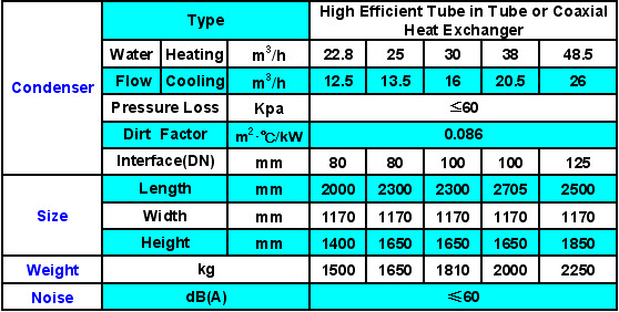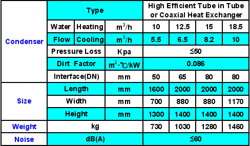 Notes: 1.Cooling Standard Conditions:User side water inlet/outlet 12℃/7℃;Water source side inlet/outlet 30℃/35℃. 2.Heating Standard Conditions: User side hot water inlet/outlet 40℃/45℃;Water source side inlet/outlet 15℃/7℃; Max. Hot Water Output: R410a-55°C; R134a-65°C; R407c-55°C; 3.Heat recovery equipments can be added for free sanitary hot water.