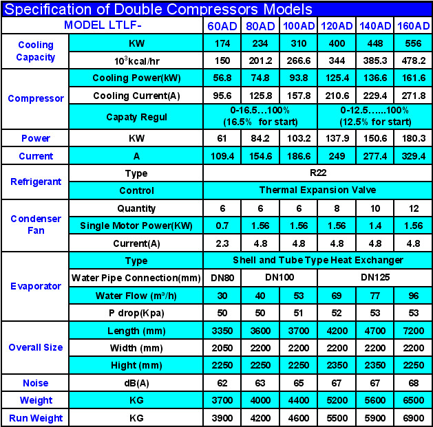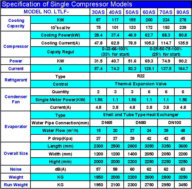 Remark:1.Colling Condition: Cold water in/out 12/7℃; Environmental 35℃; 2. Power supply: 3P-380V-50HZ;with voltage allowance ±10%,voltage dif between the phase lines±2%; 3.The data above is for R22, contact us if that for R134a, R407c, R410a and other refrigerant need; 4.There may be Changes for improvement without notice, confirm always before your order.