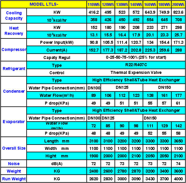 Remark:1.Colling Condition: Chilled water in/out 12/7℃; Cooling water in/out 30/35℃; 2.Power supply: 3P-380V-50HZ;with voltage allowance ±10%,voltage dif between the phase lines±2%; 3.The data above is for R22, contact us if that for R134a,R407c and other refrigerant need; 4.There may be Changes for improvement without notice, confirm always before your order.