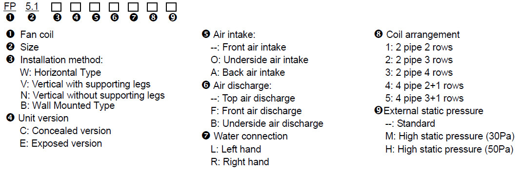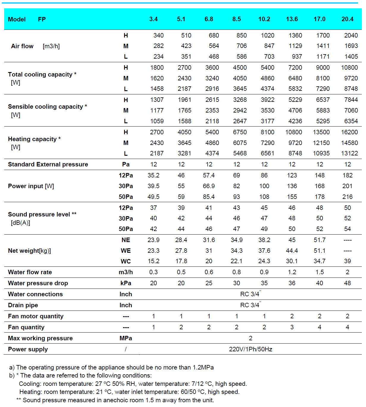 Vertical (Floor Standing) Type Fan Coil Unit The FP series water chilled fan coil units are designed specially to meet the varied requirements of zone cooling or heating using chilled water or hot water. Fan coil can be applied to two or four pipe systems to satisfy the requirements of a wide variety of air conditioning or heating application. The FP series is available in concealed and exposed versions for ceiling and floor installation. This unit is presented as a single block including: fan deck, cooling and/or cooling coil, removable filter, drip tray, electrical connection box and decorative cabinet (excluded for concealed version). FEATURES INSIDE UNIT Panels and frame are made of galvanized steel, properly punched and punched for fixing both accessories and the unit itself, either to wall (vertical version) or ceiling (horizontal version). HEATING COIL The coils are made of seamless tubes expanded into aluminum fins in continuous block. The connections have brass headers with female fittings and provided with easily accessible vent and drainage valve. FAN DECK The fan decks are composed of double suction centrifugal fans with aluminum impellers and 3-speed fan motors. Each fan motor assembly is dynamically balanced. FILTER The easily removable filter is made of filtering honeycomb polypropylene fabric and supported by an aluminum or plastic frame. DRIP TRAY The drip trays are made from sheet metal treated with polyester powder coating to ensure total resistance to atmospheric agents. The “L” type tray makes the units suitable for both vertical and horizontal installation. ELECTRICAL CONNECTION BOX All electric wires are connected to enclosed electrical terminal block, situated on the opposite side to the water connections. DECORATIVE CABINET The decorative cabinet has a modern design that blends in with any environment. It’s made from galvanized steel treated with polyester powder coating to ensure total resistance to rust, corrosion, chemical agents, aliphatic solvents and alcohols. The discharge grille and supporting legs are made of ABS materials. ON-BOARD THERMOSTART Mechanical type for two pipe system exposed version use, working mode selection (OFF-Heating-Cooling), ventilation (HIGH-MED-LOW) and room temperature setting. OPTIONAL 1. Condensation tray (water connection area) 2. Different type thermostats with more advanced functions 3. High external static pressure 30Pa and 50Pa